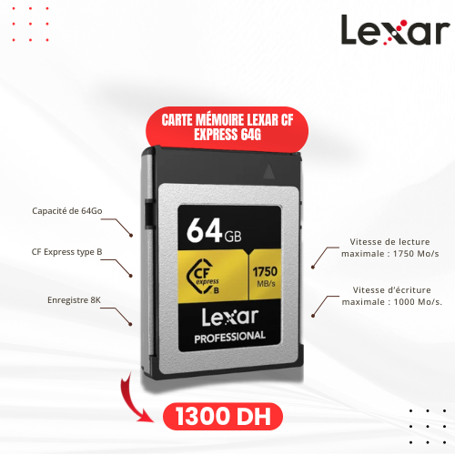 Carte mémoire Lexar CF EXPRESS 64G, 1750 mb/s, Type B